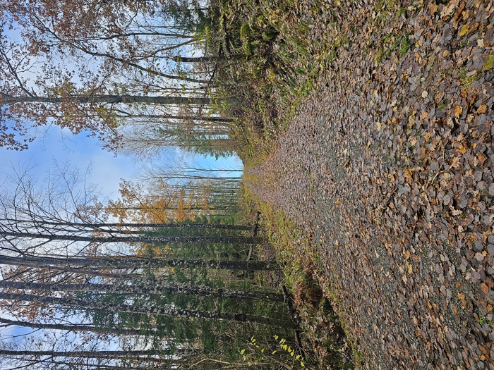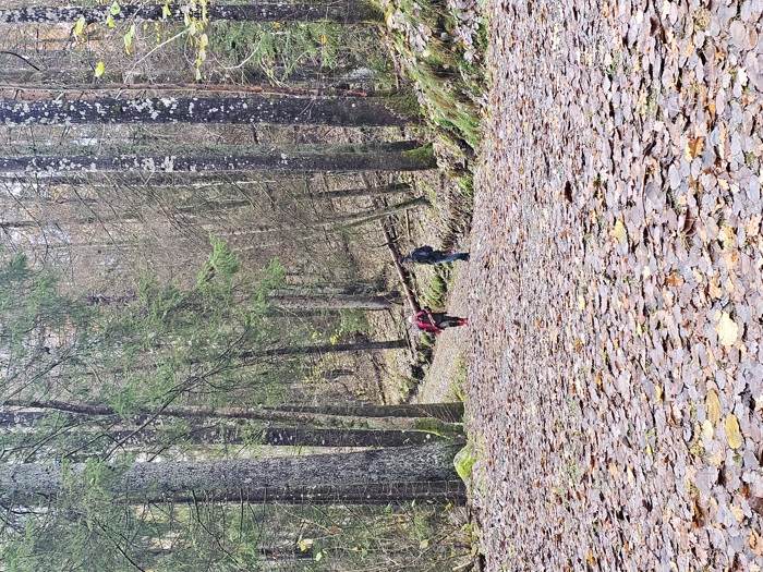 Under ledelse av Peter fulgte vi en naturlig trasé (brukes av de lokale) fra Kleivaveien og til kraftgaten som krysser en naturlig trasé for kyststien. Dette er den samme kraftgaten som kommer opp fra Holtberget (Heitmann). Fra kraftgaten og ned til Holtberget er det bratt og krevende, men det ser ut til at gruppen har funnet den minst bratte ruten.